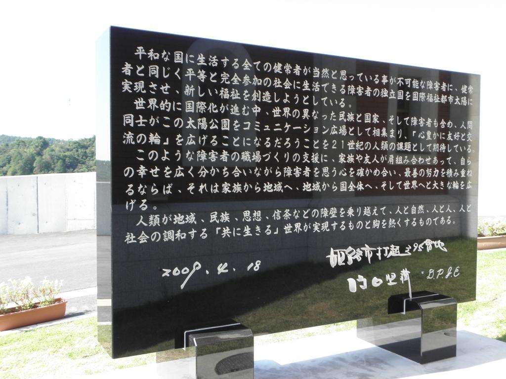 私達太陽福祉グループは、人間一人ひとりに、時には厳しく時には優しく「平等の愛」を与える太陽の輝きに感動と喜びを感じ、雨にも負けず風にも負けず、障害者も健常者も共に手をたずさえ、自助共助を重視する社会づくりに使命感と誇りをもって、この新しい障害福祉の創造に全力をもって挑戦し、永遠に愛のある社会を築くための努力を惜しみません。